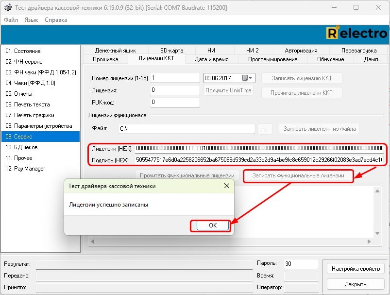 Примечание! Если с открыванием файла с лицензией возникла проблема, то можно ввести реквизиты лицензии из файла в поля «Лицензии (НEX)» и «Подпись (HEX)» вручную. Для этого откройте файл лицензии в любом текстовом редакторе (например, в Блокноте). Найдите соответствующий заводской номер ККТ (первое поле в файле лицензий). Скопируйте из файла и введите в окно «Лицензии (НEX)» значение лицензии (второе поле в файле лицензий), а в окно «Подпись (HEX)» – подпись лицензии (третье поле в файле лицензий). Значение и подпись лицензии вводятся в поля без пробелов, знаков табуляции и прочих лишних символов. - Нажмите кнопку «Записать функциональные лицензии». В случае успешной записи лицензии в ККТ утилита Теста драйвера подтвердит это всплывающим сообщением. Лицензия установлена в ККТ.